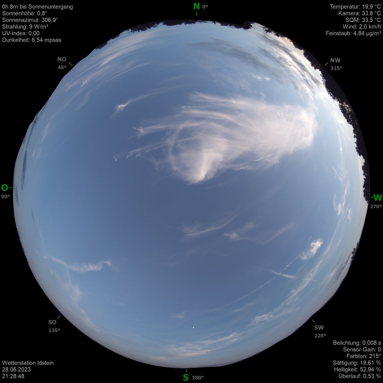 In der Historie der letzten Fotos der Lindenberg-Cam unter https://opendata.dwd.de/weather/webcam/Lindenberg-NNE meine ich auch NLC-ähnliche Strukturen zu erkennen. Allerdings hat der Mond schon recht kräftig geschienen und alle Wolkenarten schön aufgehellt. Bereits am Tag hatten wir u.a. interessante Cirruswolken bei uns:
