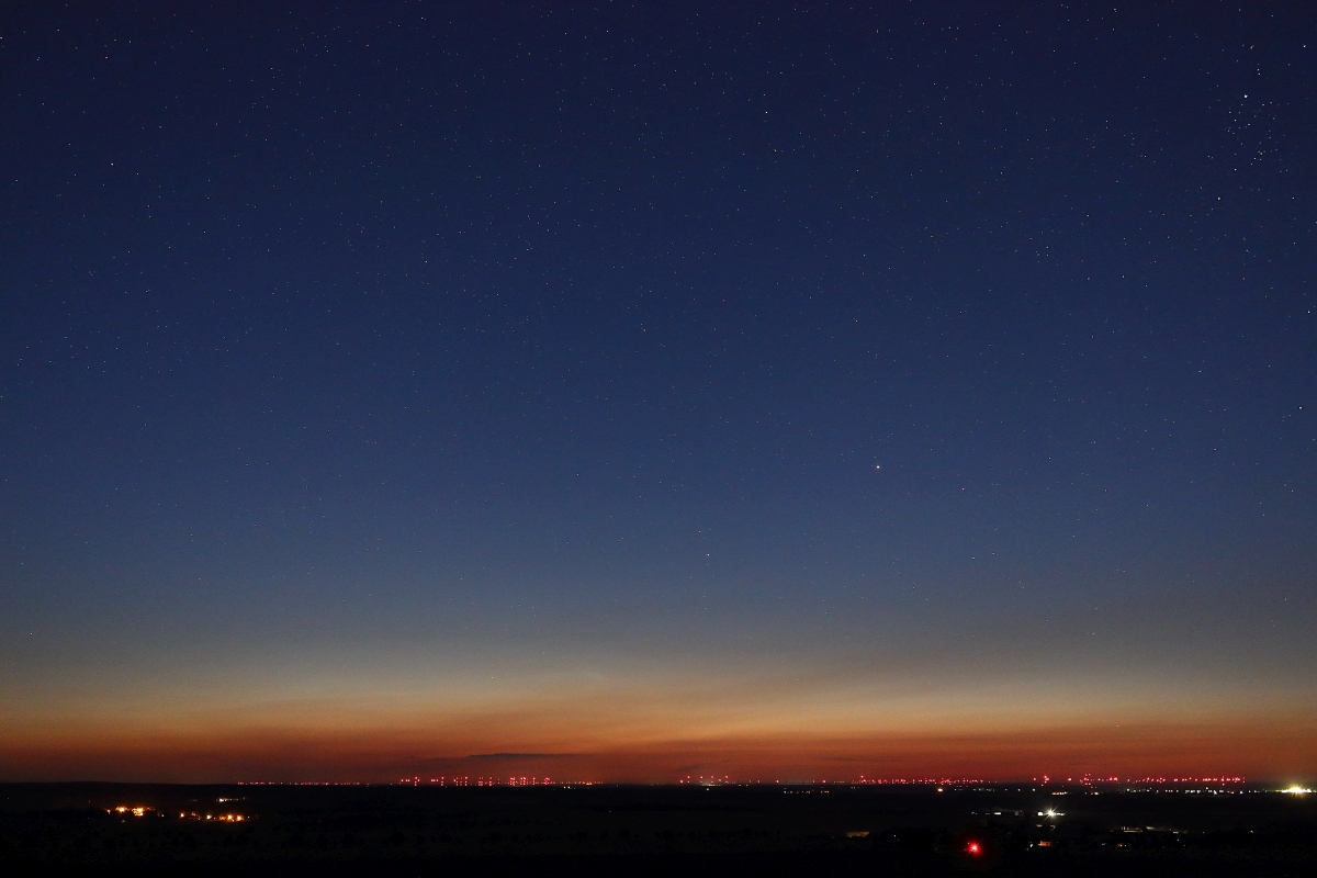 Das hätte ein schönes Morgendisplay geben können, selbst von meinem diesmal relativ weit südlich gewählten Standort, dem Liebschützberg nördlich von Oschatz. Die nächste Rauchfront nordamerikanischer Waldbrände machte mir dann allerdings unerwartet einen gehörigen Strich durch die Rechnung. Von daher hat es für viel mehr als einen Nachweis (ausschließlich fotografisch) am Ende leider nicht gereicht. Schade um die eigentlich recht guten Bedingungen, die sich auch dadurch noch unverhofft verbesserten, dass sich einige Ortschaften um den Liebschützberg vor noch nicht all zu langer Zeit offenbar dazu entschieden haben müssen, nachts die Straßenbeleuchtung abzuschalten. Mit dieser positiven Erkenntnis fällt es mir dann auch wesentlich leichter, gedanklich einen Schlussstrich unter diese Nacht zu ziehen.