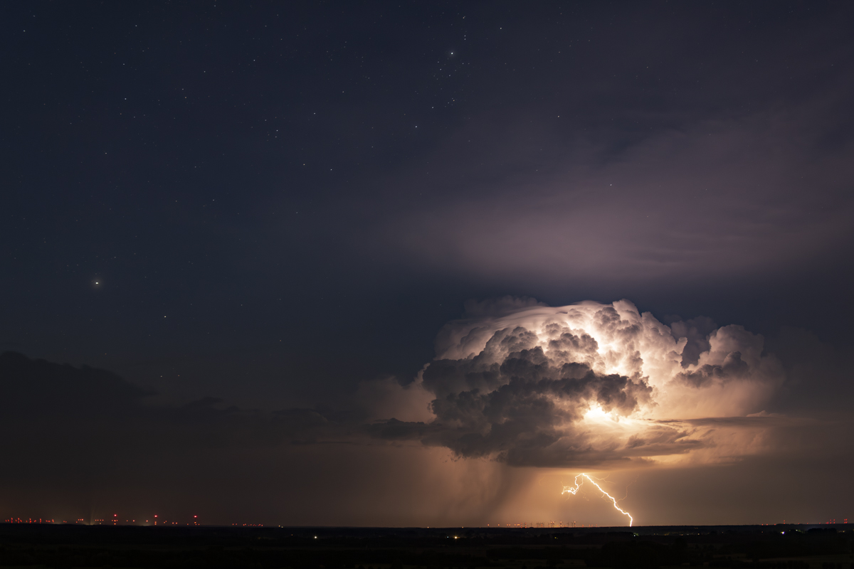 Durch den Regen ging es heimwärts. Kaum war dieser durchquert und das Seitenfenster wieder offen, fuhr ich bei schwüler Sommerregenluft über dampfende Straßen in Richtung Wiehengebirge. Am gesamte Himmel waren Blitze zu sehen, im Süden wieder erste Sterne. Also ging es hoch ans Wiehengebirge, um das Geschehen am Himmel einzuordnen.