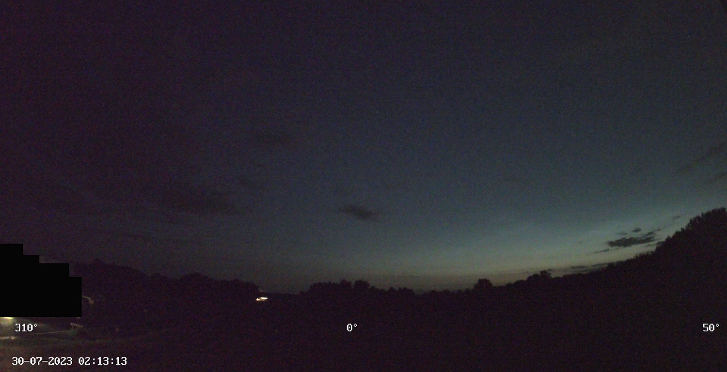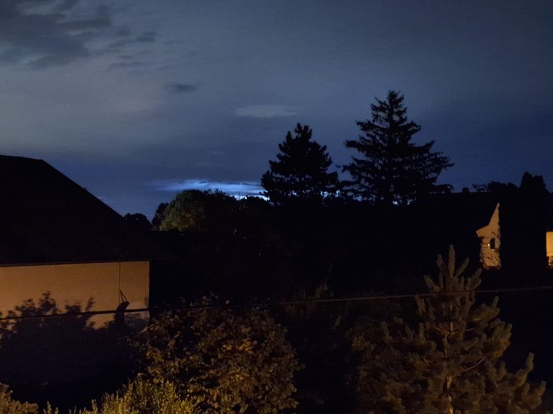 heute Morgen (30.07.23 03hMEZ) zeigten sich in einer Wolkenlücke gegen 03h MEZ in Nord, Nordost diese auffällig blau elektrisierten Wolken hinter den Tannen und am Horizont, dort sind keine Lichter oder irgend eine Fabrikanlage und an normalen Nächten ist es dort normal aufgehellt von der Lichterglocke Wiens, also eher trüb - dunkel - ich vermute, es waren NLC`s, denn ich weis diese von Cirren zu unterscheiden.