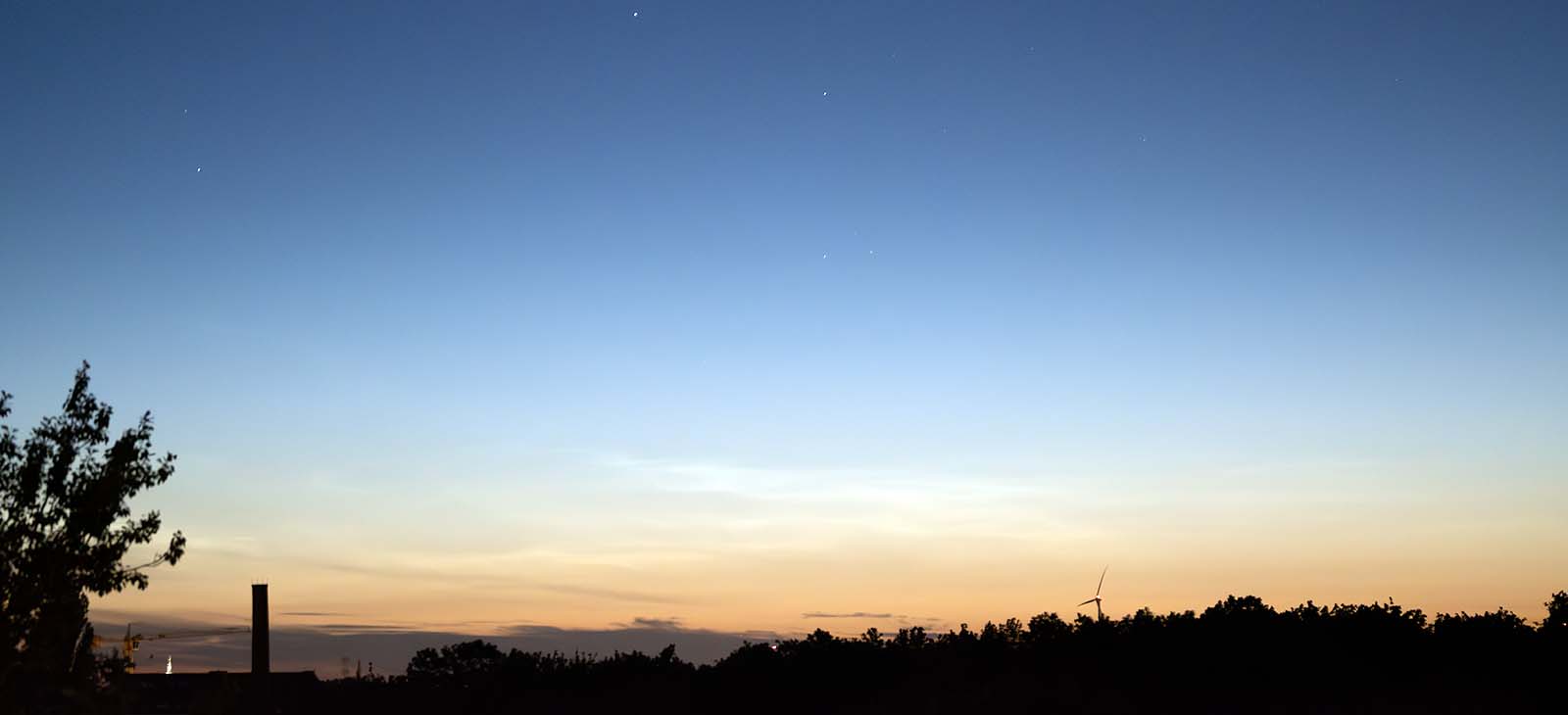 - Sonne nur noch ca. 10° unter dem Horizont, wodurch schwache NLC bereits durch die Dämmerung kaschiert würden, eine kräftige NLC-Entwicklung jedoch noch hell erschiene ...
