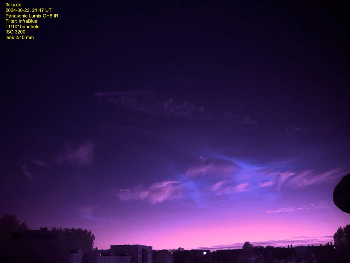 Hier mal ein sehr experimenteller Eindruck mit IR-Kameraumbau (die NLC sind blau, die Cirren hier wieder ~ rosa, obwohl eigentlich grau/dunkel):OlafS hat geschrieben: ↑23. Jun 2024, 21:41 Moin zusammen,