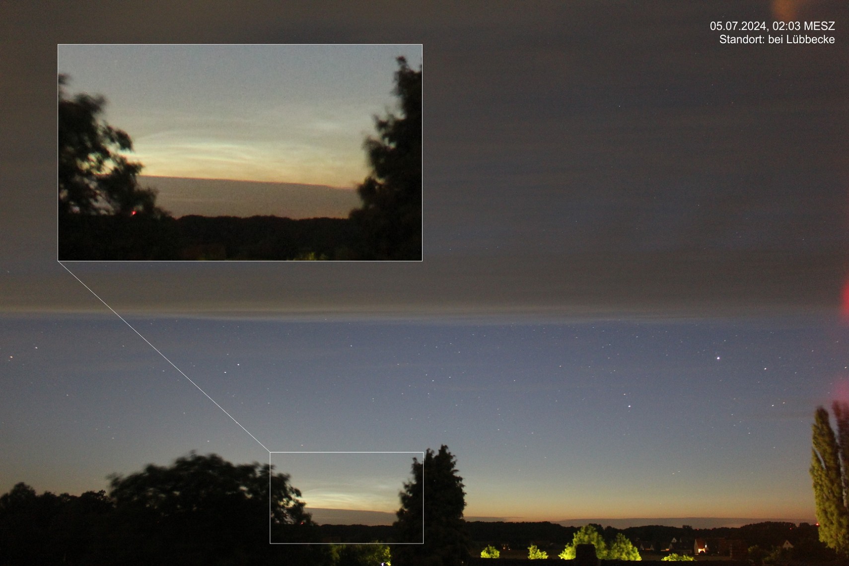 Thorsten seine Wolkenkante (oder auch die der Ettelsberg-Cam), hier bei mir fast bedrohlich anmutend, hat es auch mit ins Bild geschafft, die NLCs dieser Nacht darunter. Die Entwicklung dieses NLC-Feldes hat sich nachträglich nahezu vollständig verfolgen lassen, bis sie nach drei Uhr (Ortszeit) dann noch weiter gen Westen gezogen sind: