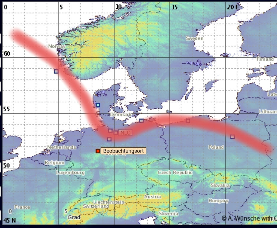 Edit: Alexander Wünsches Tool bemüht... Von den extrem schwachen NLCs in 35 Grad mal abgesehen erstreckte sich das Feld von Polen kommend Richtung Ostseeküste, um auf Höhe Deutschland dann über MV und NDS bis an die Landesgrenze NRWs zu schwenken... Dort bog es ab hoch Richtung NNW bis Esbjerg, um sich dann über der Nordsee knapp südlich von Kristiansand und Stavanger zu verlieren...