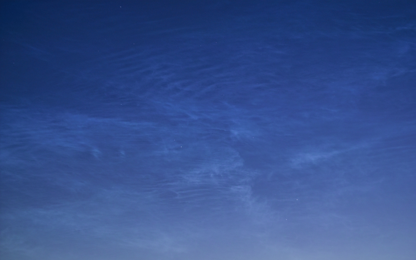 Gegen 10 nach 04 drückte die Blase... Vom Badezimmerfenster bot sich mir ein - durch die Dunkeladaption der Augen - ein schwaches, aber recht hohes NLC-Feld, welches anders wie auf den Bildern noch ne Ecke weiter Richtung Ost reichte (Edit: Nach Checken der anderen Webcam reichten die NLCs bis AZ 60 Grad)