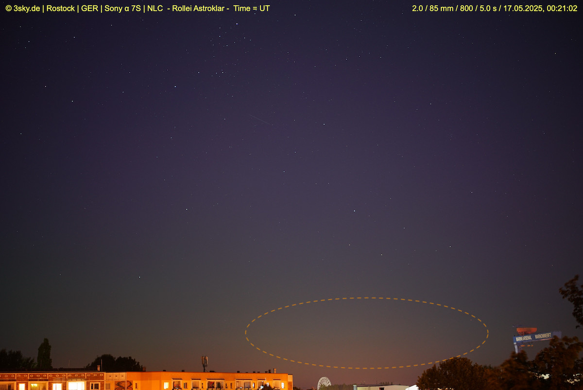 Da ist nirgendwo etwas, was auch nur entfernt nach NLCs aussieht. Ferner habe ich mit dem fraglichen Frame der Gahlkow-Cam in Irfan-View gespielt. Der unscharfe Streifen tief in der Dämmerung ist m.E. echt, also kein Aufnahmeartefakt. Mehr lässt sich auch nicht sagen; es könnte sich z.B. um den Rest des grünen Polarlichtbogens handeln, eher aber um troposphärisches Gewölk. NLCs ganz ausschließen mag ich wegen der etwas angegrotteten Qualität des Fotos auch nicht. Da aber an den anderen Cams und auch auf weiteren Frames der Gahlkow-Kamera nichts dergleichen erscheint, sollten wir das m.E. als vagen Verdachtsfall ad acta legen.
