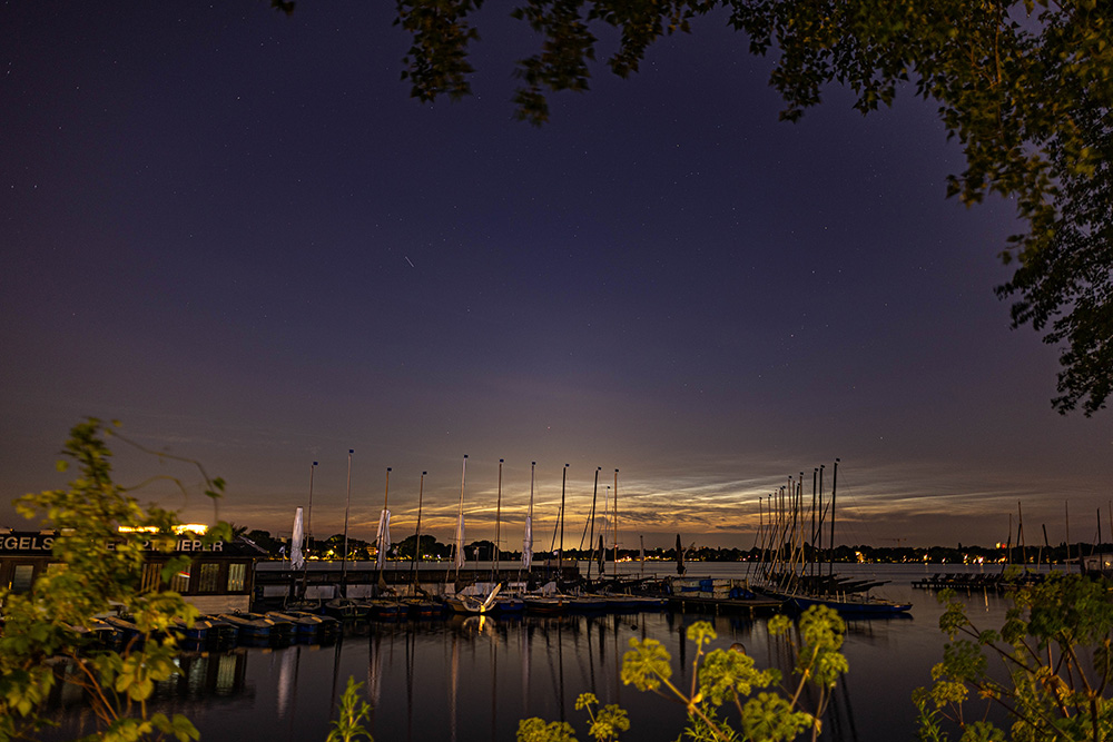 Die NLCs waren bereits kurz nach 22:30 Uhr sichtbar geworden als sehr schwache Streifen. Ich positionierte mich an der Außenalster in Hamburg, was für mich ein schöner Beobachtungsort mit tollen Motiv war (Wasser+Boote). Dort konnte ich dann ein recht ansehnliches Display beobachten, was schnell von Helligkeit 2 auf 3 anstieg. Die meisten NLCs endeten etwas über Capella in etwa 13° Höhe, zu Beginn konnte ich aber auch darüber noch schwache Strukturen ausmachen (zogen in die selbe Richtung wie die NLCs darunter), welche bis 35° gingen. Im Anschluss pendelte es sich bei knapp über Capella ein, sank im Verlauf dann auf etwas mehr als die Hälfte der Höhe von Capella ab. Was mich am meisten erstaunte war die Helligkeit, welche bis H4 anstieg. Selbst in der doch recht hellen Umgebung in Hamburg waren die Leuchtenden Nachtwolken sehr auffällig und die Strukturen klar sichtbar. Erst zum Ende hin nahm die Helligkeit wieder allmählich auf 3 ab. Gegen 1 Uhr beendete ich dann die Beobachtung aufgrund von Wolkenaufzug. Anbei ein paar Bilder: Ein Zeitraffer der NLCs gibt es hier: https://mbwetter.de/wetter/NLC/2025/NLCs_170625.mp4