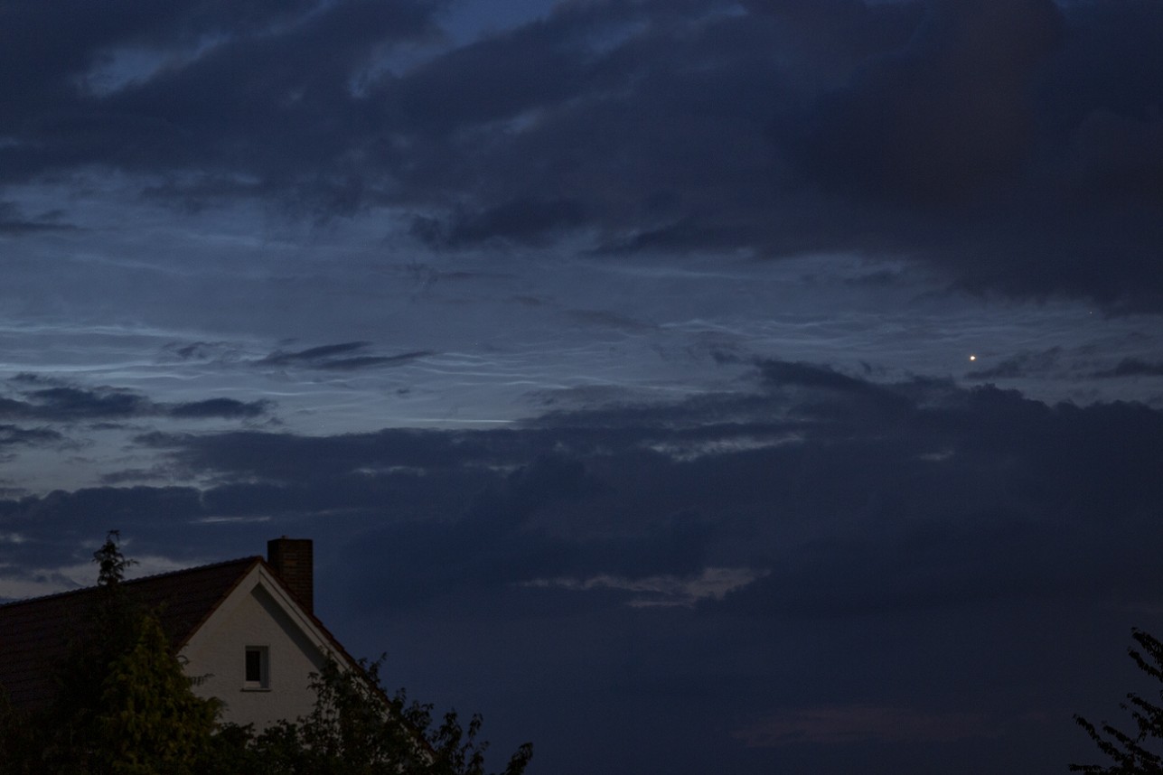 Da in Hemmingstedt die Bewölkung durchgängig die Sicht in den Himmel verhinderte, war ich überrascht als kurz nach 3 Uhr durch das Fenster Mondlicht zu sehen war. Im Garten waren NLC deutlich zu sehen. Bis sich die Wolkendecke wieder zuzog gelangen mir ca. eine viertel Stunde Aufnahmen.