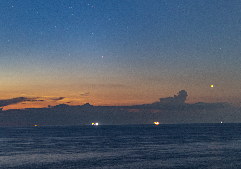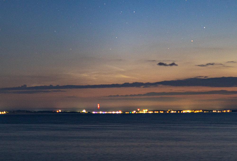 Da in Hamburg das Wetter generell (mal wieder) sehr schlecht war, fuhr ich dieses Mal an die Ostsee, wo sich bei Ankunft der Himmel fast vollständig klar zeigte. Dies blieb bis zum Beobachtungsende auch noch einigermaßen, wnngleich ein paar mehr Wolken und viel Dunst aufzogen. Das erste Mal NLCs nachweisen konnte ich gegen 23:00 MESZ, sie standen unterhalb von Perseus bei etwa 2-3° Höhe: Das kleine Feld schien im Verlauf zu zerbröseln und wanderte dann nach Westen, wo es horizontnah und nur fotografisch nachzuweisen war: Nahc 0:30 MESZ war vorerst nichts mehr, erst gegen 2:30 MESZ zeigten sich zwei Felder. Das eine unterhalb des großen Wagens, das andere westlich der aufgegangenen Venus. Bei Felder standen auch nicht wirklich hoch bei etwa 2°: Das östliche verblasste recht zügig, das westliche hielt sich noch etwas länger und wanderte noch ein Stückchen nach Westen, ehe es auch zunehmend verblasste: Im Anschluss brach ich die Beobachtung ab. Anbei die Daten: