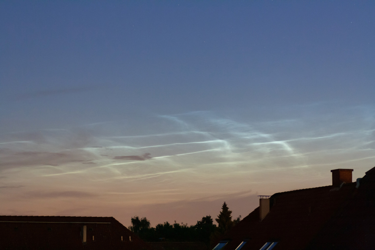 sehr hübsche Nachtwolken gabs auch in Lübeck zu sehen, doch ziemlich schnell zogen die dunklen Wolken eines Regengebiets auf, die weitere Beobachtungen ab 03:15 MESZ verhinderten.