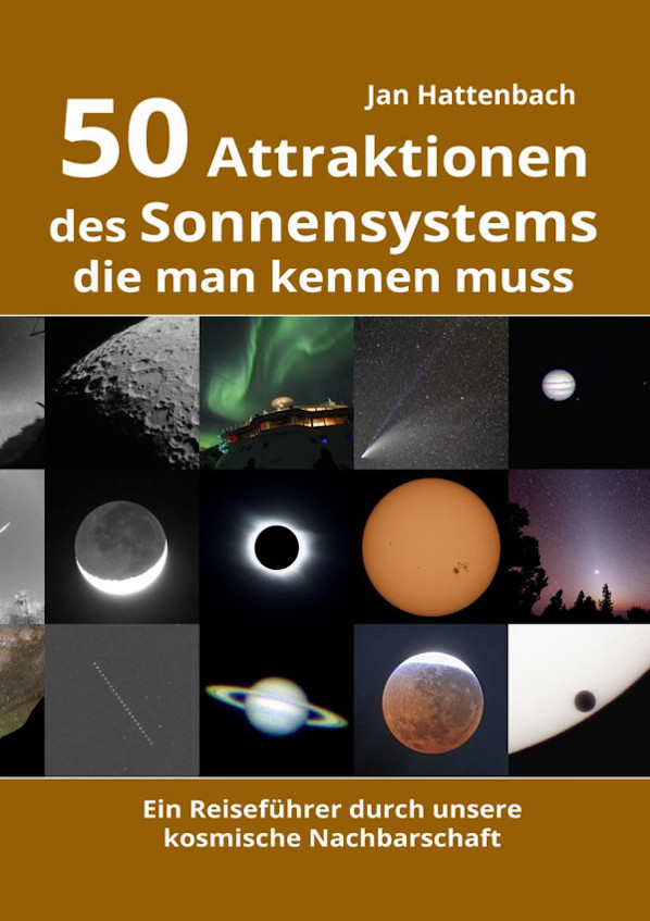 50 Attraktionen des Sonnensystems, die man kennen muss behandelt alle Phänomene und Objekte, die man als Amateurastronom im Sonnensystem verfolgen bzw. beobachten kann. Dazu gehören natürlich die großen Planeten und all die Phänomene, die man auf ihnen sehen kann, die Ereignisse auf der Sonne oder die interessantesten Regionen der Mondoberfläche. Hinzu kommen weitere Attraktionen des Sonnensystems oder der direkten Erdumgebung, die vielleicht nicht so bekannt, aber sehr interessant sind: Airglow, Polarlichter, das Zodiakallicht und der Gegenschein beispielsweise. Und natürlich dürfen auch Meteore, Meteorströme und Kometen nicht fehlen. Und wie berechnet man eigentlich die Entfernung zu einem Asteroiden - aus eigenen Beobachtungen? Für die meisten der 50 Attraktionen braucht man ein Teleskop. Doch erstaunlich viele Phänomene unseres kosmischen Hinterhofs lassen sich schon mit einem Fernglas oder sogar den bloßen Augen studieren.