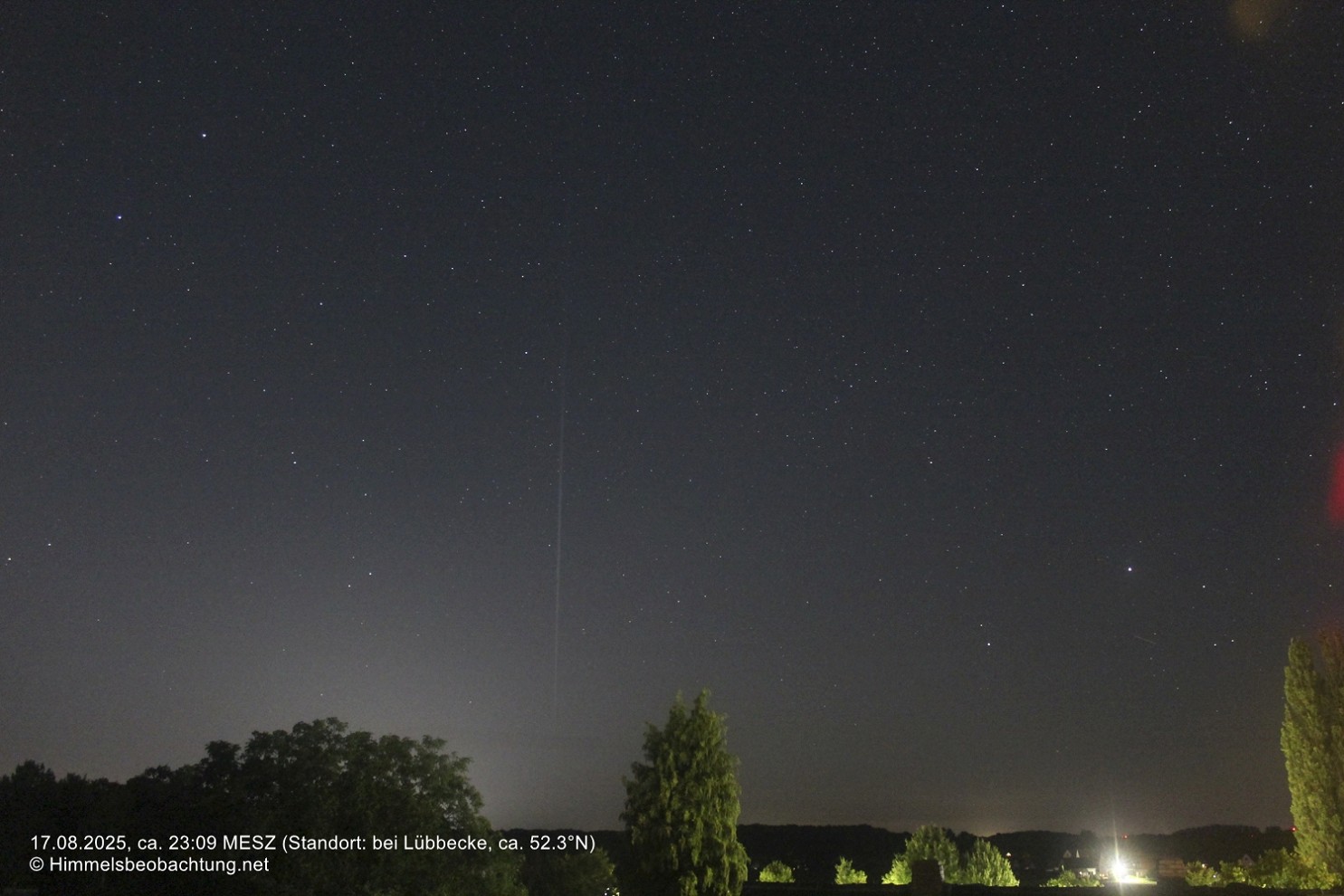 zum 17.08.2025 kann ich sagen das ich ab 23:05-23:17 MESZ ebenfalls von der Ostseeküste in Hohwacht die Auffälligkeit sah und dann die Kamera schnell im Intervall laufen lassen habe. Nachdem der Lichtstrahl aus Richtung Norden nach Süden verlaufend nicht mehr sichtbar war, sah ich mich nach Süden um und entdeckte Richtung Zenit eine Sattelitenkette mit ca. 5 aufeinander folgenden Punkten die Richtung Süden zog. Die Sichtungen der Fotos im Nachgang zeigen vermutlich das aussetzen von Satteliten und die Trägerrakete selber. Lt. meiner Recherche kommt da ein Raketenstart vom 17.08. / 16:15 UTC aus China in frage. (SatNet LEO Group 09 - Long March 6A CASC)