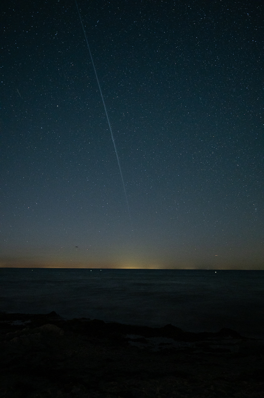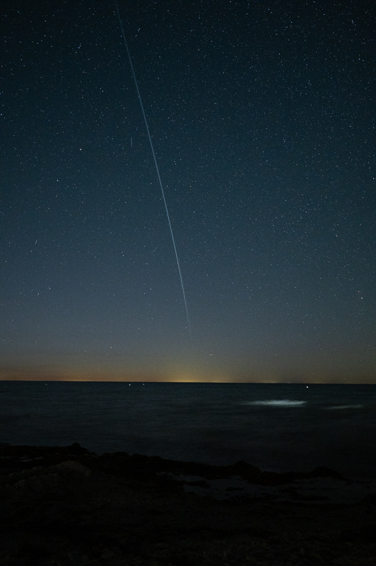 Ab Bild 3, links an dem hellen Strahl ist vermutlich der Satellit. Er bewegt sich von unten an der Linie nach oben, bis ich ihn nicht mehr auf den Fotos habe.