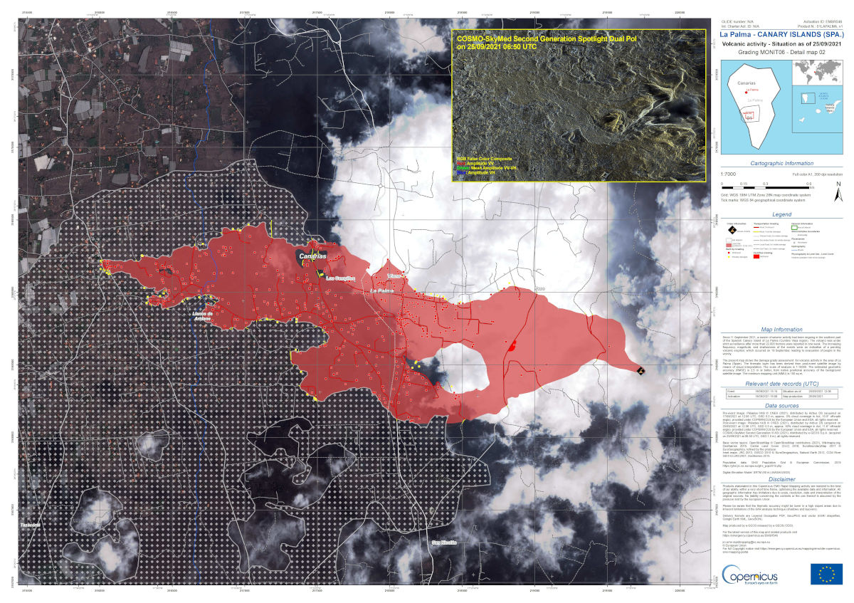 Interessant für die, die sich für die genaue Position des Vulkans und der Lava interessieren: Der Copernicus Emergency Management Service wurde aktiviert und hat erste Karten online gestellt, die das Ausmaß des Lavastroms zeigen. Dieser bedeckt eine Fläche von rund 154 ha (Stand 21.9): https://emergency.copernicus.eu/mapping ... ts/EMSR546