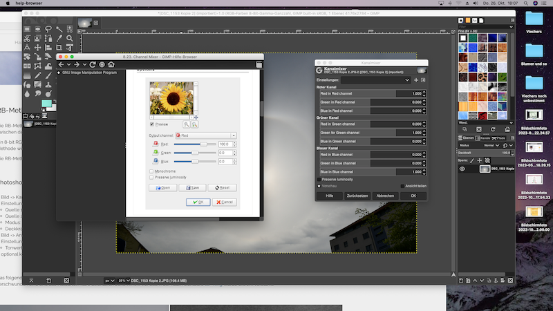 Der Kanalmixer bei Gimp für Mac ist ein ganz anderer (rechts auf dem Bild). Ich habe die Hilfe aufgerufen und dort erscheint ein Kanalmixer (links) der die im Forum besagten 3 Werte anzeigt.