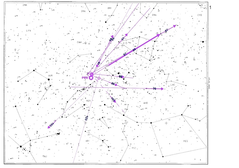 ich füge hier die Karteneinträge von meinen Beobachtungen aus den Nächten vom 8./9. und 12./13. August an. Für diese beiden Nächte konnte eine für visuelle Beobachtungen erstaunlich genaue Radiantenbestimmung erfolgen. Deutlich ist die Radiantenverlagerung in den vier Tagen zu erkennen. Vor allem die Bahnen mit kurz nachleuchtender Spur (deren Rückverlängerungen sind mit durchgezogenen Linien dargestellt) können in ihrer Richtung recht genau erfasst werden - aber bei den anderen (gepunktete Rückverlängerungen) sieht es nicht viel ungünstiger aus. Langjährige Beobachtungserfahrung macht dies möglich. Die Perseiden mit ihrer recht hohen Rate an nachleuchtenden Spuren bieten sich daher für solche Übungszwecke geradezu an. Ausführlicher werde ich über die Ergebnisse meiner Beobachtungen in Meteoros berichten.