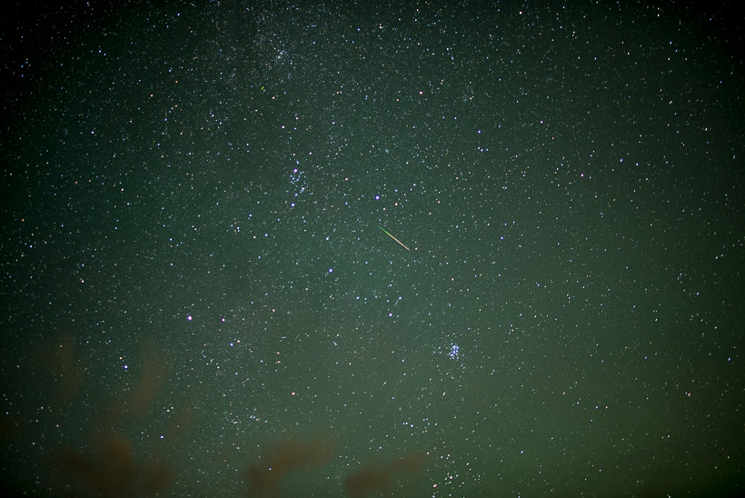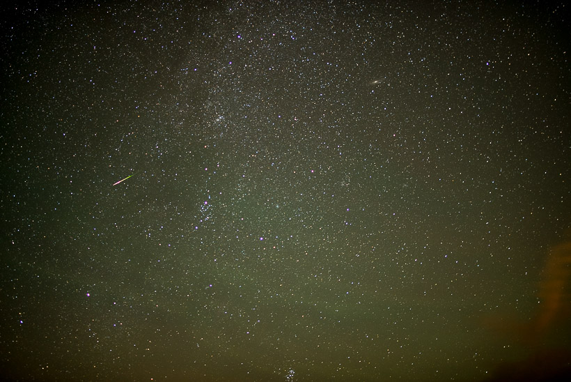 Höhepunkt war sicher der Bolide um 22:45, den ich leider nicht direkt gesehen habe, weil ich grade mit der Kamera hantiert hatte, der sich aber durch einen sehr hellen, die Umgebung aufhellenden Lichtblitz bemerkbar gemacht hat. Die Nachleuchtspur war dann auch ca. einen halben Vollmond breit.