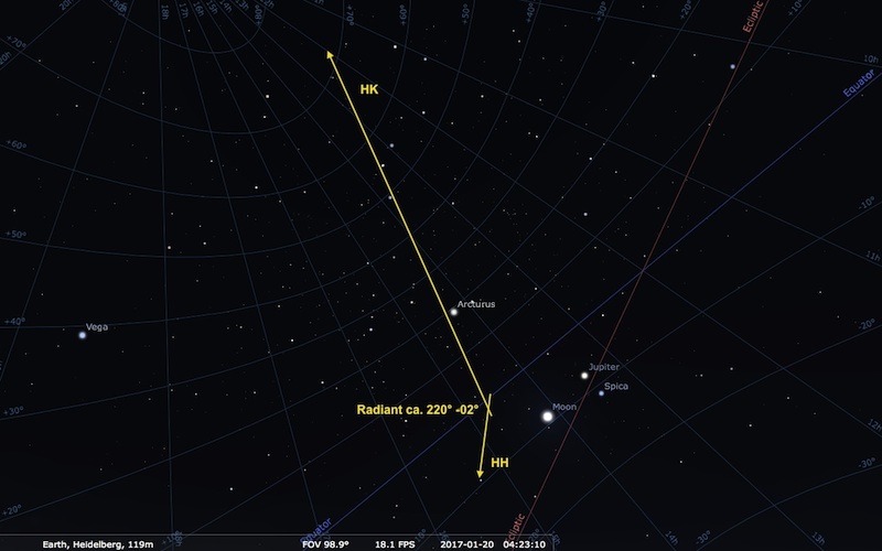 schöne Animation von Feuerkugel und Nachleuchtspur. Meine Kamera hat sie auch erwischt, links neben dem Mond. Die Bahn ist bei mir recht kurz, da sie offenbar eine große Komponente auf mich zu hat.