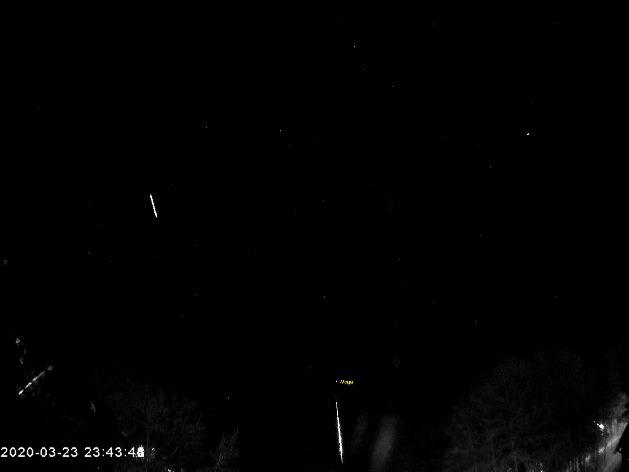 2020-03-23 um 23:43:41MEZ von Vega Richtung Horizont. Dauer ~5s. Die andere Strichspur ist ein Flugzeug.