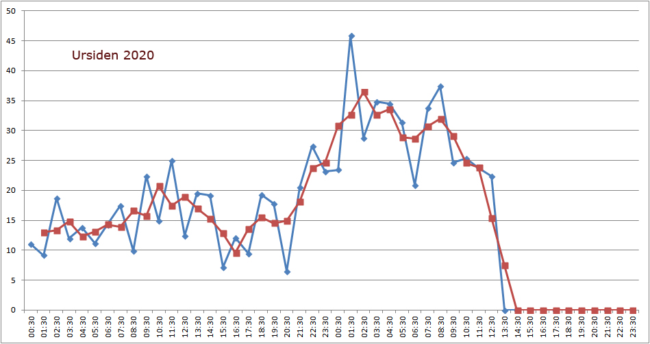 Dargestellt ist die gewichtete Rate (overdense und langandauernde Echos gehen mit höherem Gewicht ein), alles auf Radianthöhe korrigiert. Die rote Linie ist das gleitende Mittel aus drei Perioden.