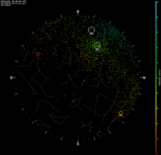 Die Andromediden (AND) scheinen dieses Jahr recht aktiv zu sein. Zumindest im Radar (CMOR) waren sie in den beiden vergangenen Nächten (Sl 237°+238°) auffällig. Dass auch visuell etwas zu sehen sein dürfte, geht einerseits aus einer Feuerkugelaufzeichnung durch das NASA-Feuerkugelnetz hervor (20211119 07-37-18 UTC), zum anderen könnte die "kleine Feuerkugel" vom 18.11. 23:45 UT auch ein AND gewesen sein.