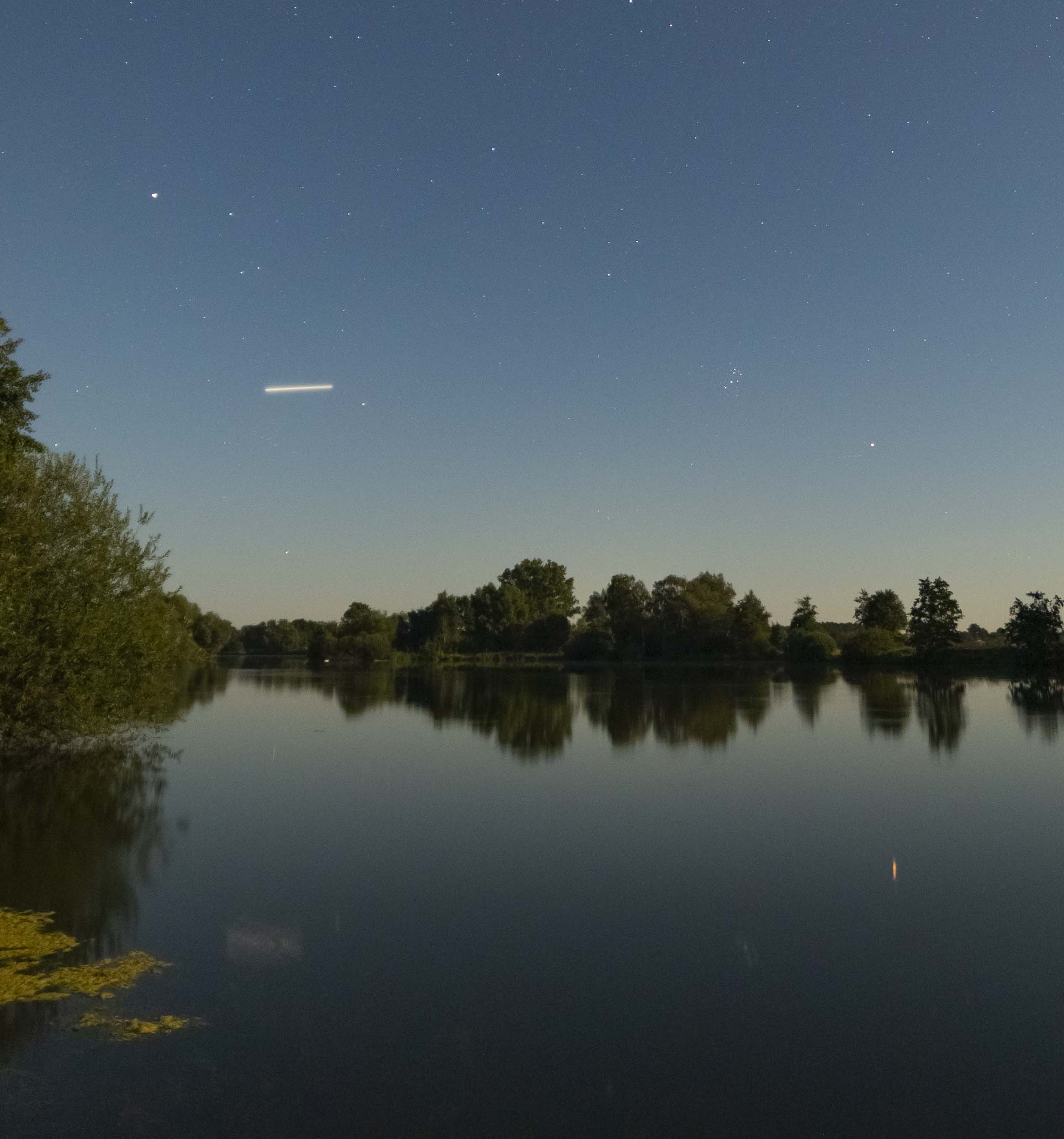 - Im See spiegelt sich die Erscheinung. Das Spiegelbild zeigt auch eine V-förmige Struktur. Wegen der Belichtungszeit 8sek müsste das auf eine Rotation zurückzuführen sein(?)