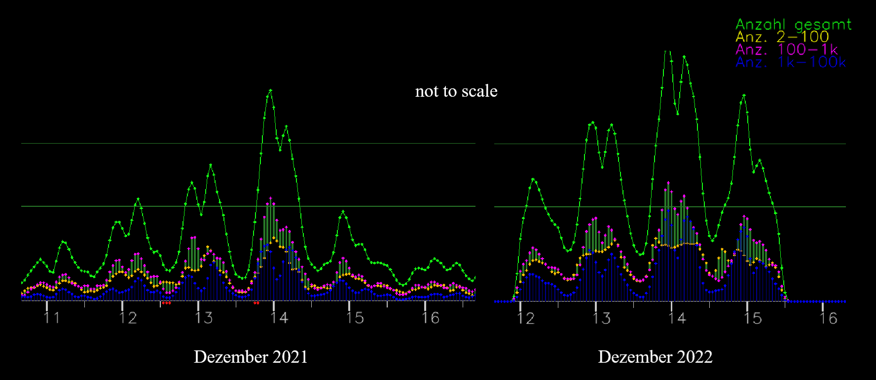 Das zweite Bild zeigt die Kerben und die In-Line-Peaks mit dieser Auflösung. Die mit den Größen der Echos gewichtete Rate ist nun orange-farbig dargestellt. Überraschenderweise haben nun im Gegensatz zu den Arietiden und den Quadrantiden die Geminiden 2021 und 2022 am 14. Dezember nicht einen, sondern zwei kleine In-Line-Peaks. Das bedeutet, dass es zwei Radianten geben muss. Die Geminiden sollten also aus 2 Teilströmen bestehen. Am 15. Dezember 2022 addieren sich die Peaks wieder zu einem einzelnen größeren Peak ungefähr an der Position des zweiten Peaks: Die Teilströme liegen nun wieder aufeinander, so meine Interpretation.