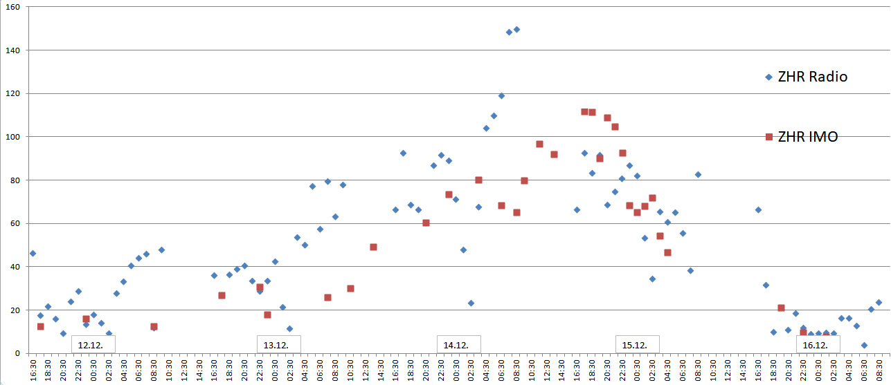 Im Moment beschäftige ich mich mit der Verbesserung der Auflösung und finde, dass die Geminiden zwei Radianten im Abstand von ~1/4 h haben.