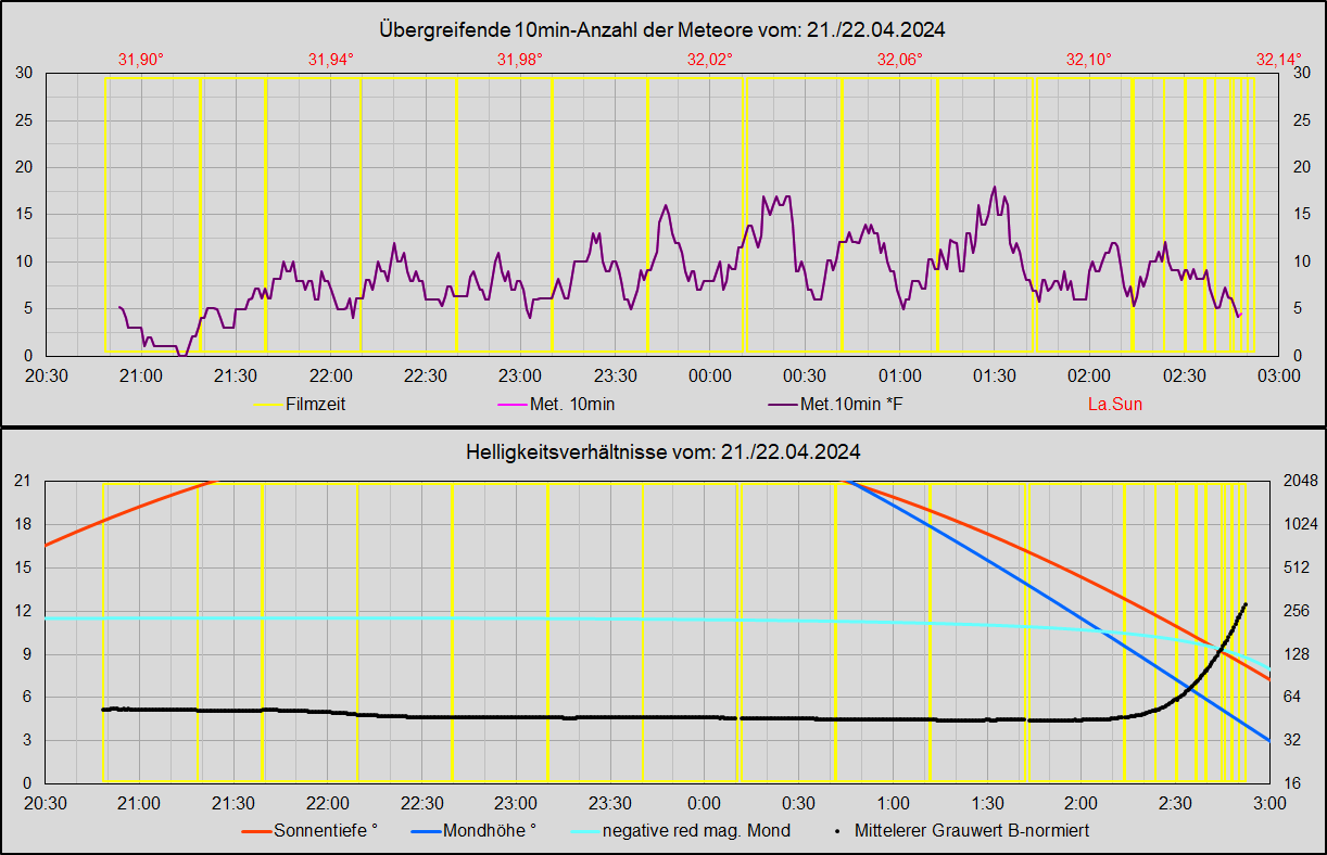 - magentafarbene Linien die Anzahl der registrierten Meteore in übergreifenden 10min-Zeiträumen.