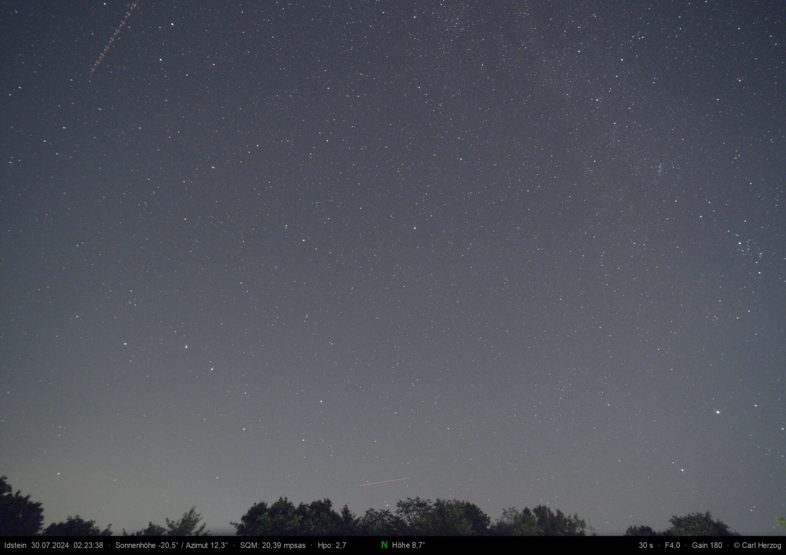 Bei meinen automatischen Kameras war hier aus Idstein (50,22°N 8,28°O) zu dieser Zeit im Nordsegment gar nichts zu sehen. Hier ein Beispiel (nur Flugzeuge und Satelliten):
