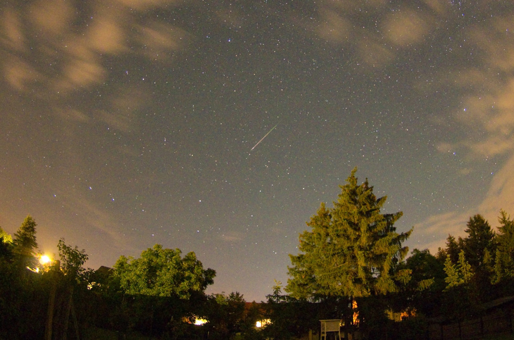 Ich war vor Ort, sobald die Wolkendecke der Front sich nach Osten zurückzog, das war gegen 23:00. Ich habe mit zwei Kameras Fotos gemacht. Eine mit Nachführung auf den Radianten (f=16mm@f/2,8, t=20s, ISO 6400) gerichtet und die zweite feststehend Richtung Norden mit Horizont (24mm@f/2,5, t=10s, ISO 6400). Beide Kameras