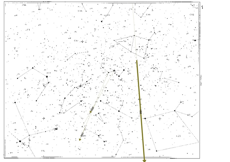 ich habe mal versucht, den Radianten der Feuerkugel zu bestimmen. Dazu habe ich die Azimut/Höhe-Daten von Rene von der IMO-Feuerkugelseite verwendet und das Bild von Hermann (hier stimmt etwas mit dem Azimut nicht, so dass ich auf das Bild zurückgreifen musste). Es zeichnet sich ein recht präziser Radiant (bei Chi Dra) ab! Aufgrund der Länge und der Zeitdauer der Erscheinung konnte ich die Richtung recht gut erfassen – und die passt bestens zum Schnittpunkt der beiden fotografischen Daten (die ihrerseits evtl. noch genauer ausgewertet werden können).  Leider helfen die restlichen