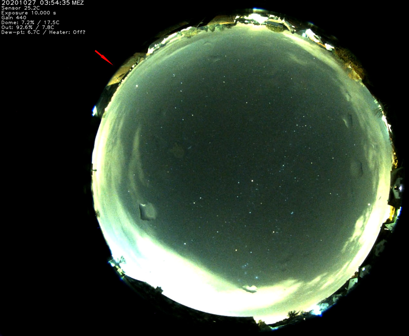 ich hatte auf der Kamera einen Helligkeitsausbruch bemerkt, der von einem Meteor mit Trajektorie zu mir hin oder von mir weg stammen könnte. Die Sichtverhältnisse waren miserabel zu der Zeit in anderen Teilen Deutschlands, trotzdem hoffe ich jemand anderes kann das noch verifizieren.
