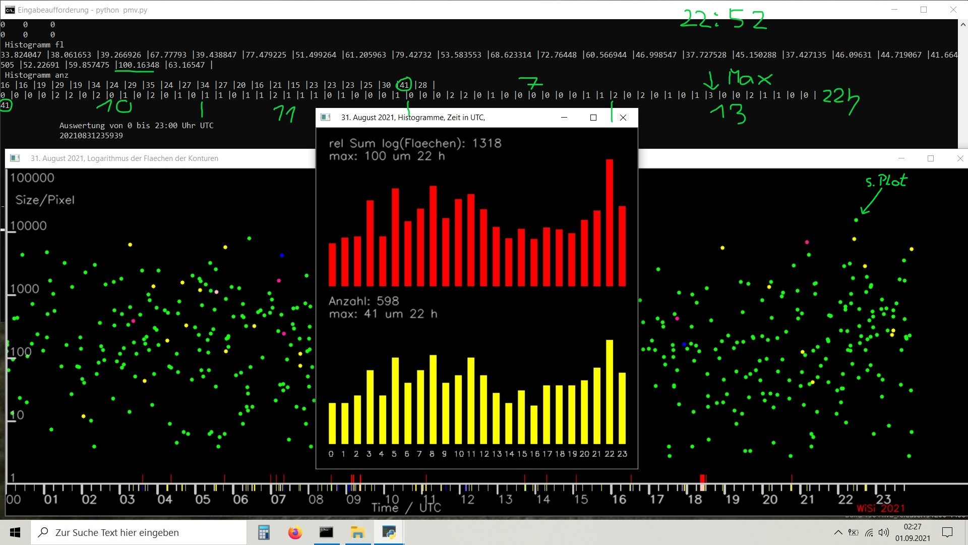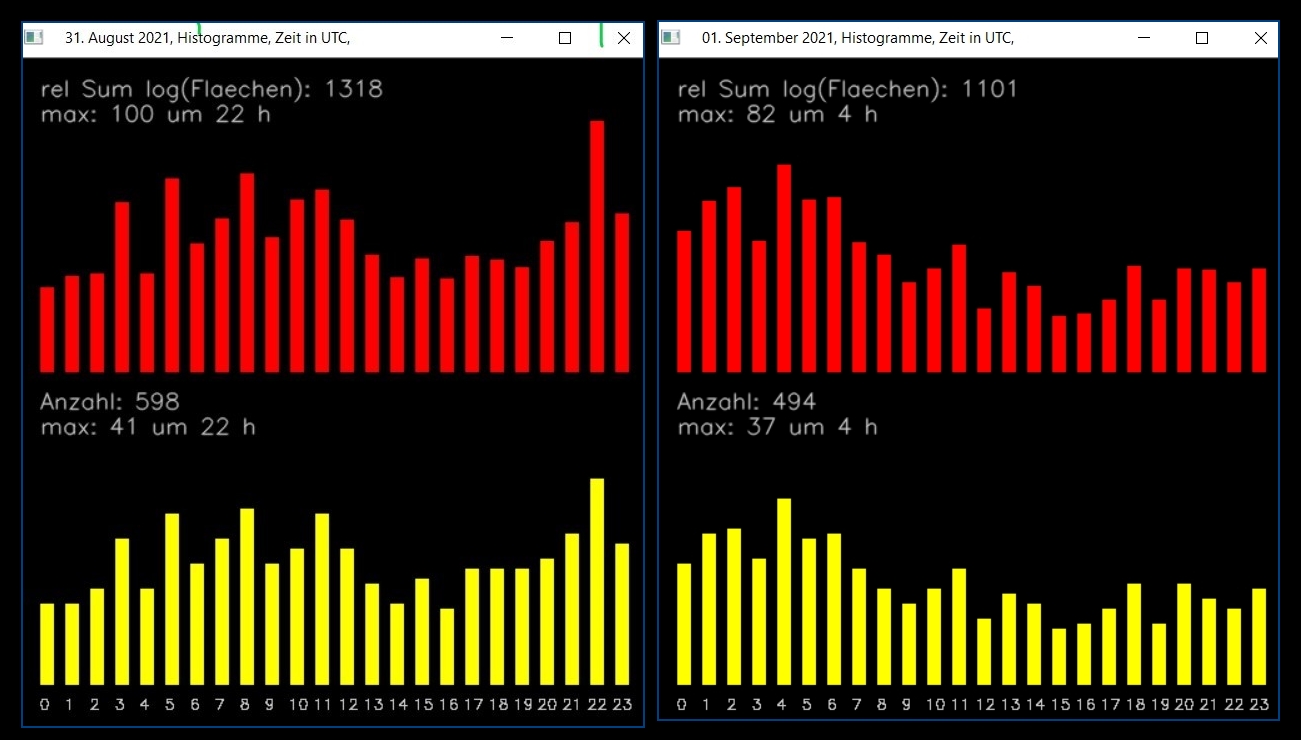 Die Auswertesoftware ist eine Eigenentwicklung und kann auch näherungsweise die Größen (Massen der Meteoroiden) der Echos bestimmen. In den Plots mit den vielen (grünen) Punkten sind die Echos logarithmisch aufgetragen. Die roten Balken des Histogramms sind die Summen der Flächen der Spektrogramme, die gelben Balken zeigen die Anzahl. Die Basislinie für den Zeitraum des Outbursts kann man in etwa dem Histogramm vom 1. September entnehmen.