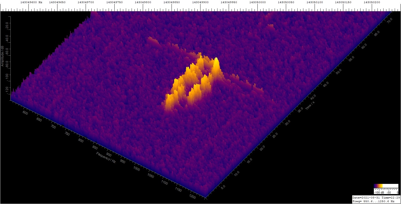Die Echos des GRAVES Radars werden mit der freien Software Spectrum Lab (SL) aufgezeichnet. SL schreibt bei mir im Abstand von 20 Sekunden 3-D Plots auf die Festplatte, die ich dann zu einem späteren Zeitpunkt auswerte. Ein Beispiel von 22:29 UTC ist beigefügt. Datum und Uhrzeit schreibt SL in den Filenamen.