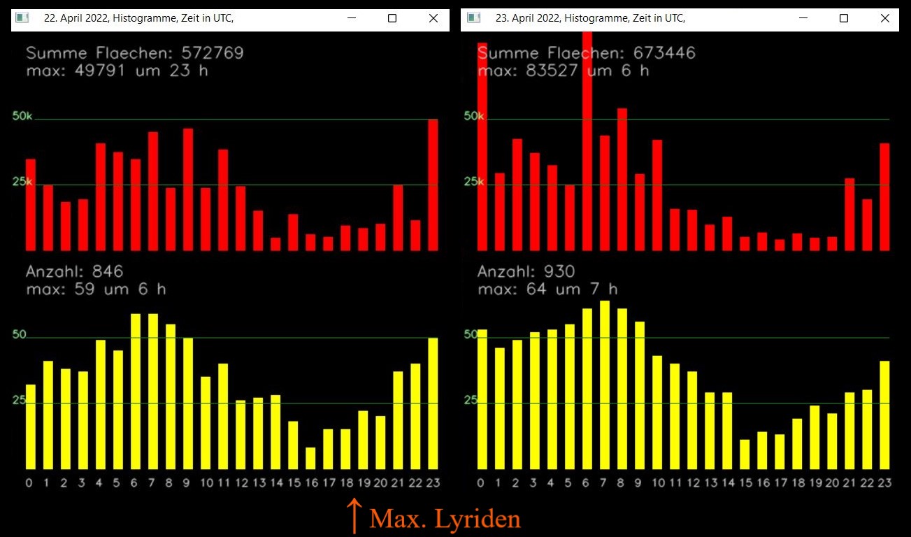 Hier im Münsterland lag der Radiant zu der Zeit noch unter dem Horizont. Erst danach stieg die Aktivität und in den 23. April hinein gab es viele und auch große Echos, siehe Bild 1.