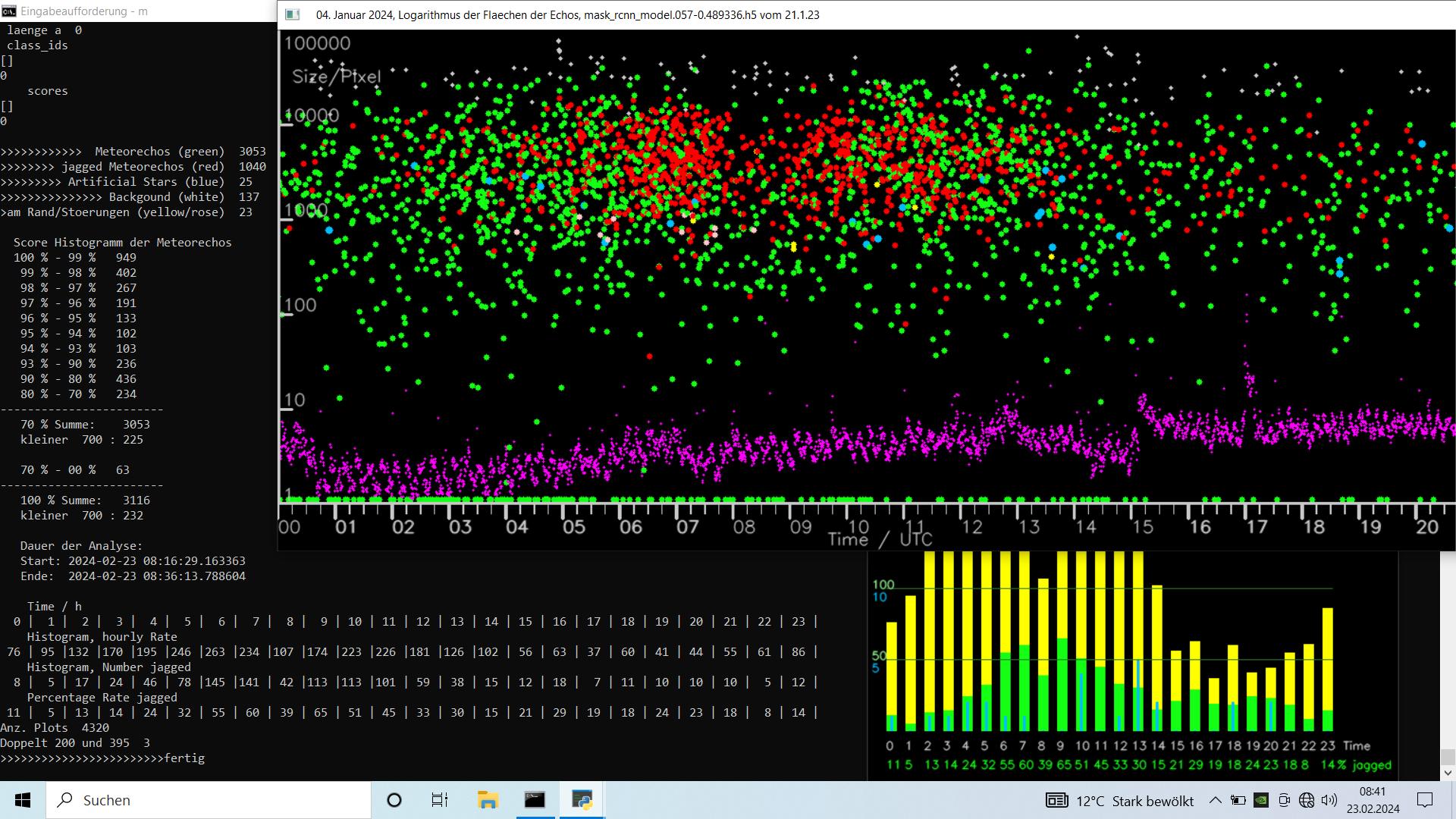 Noch besser ist der Effekt im zweiten Bild zu sehen. Das sind die Quadrantiden 2023, die im Artikel nicht vorkommen. Interessant ist noch, dass die gezackten Echos, die roten Punkte, in einem relativ schmalen Größenbereich liegen.