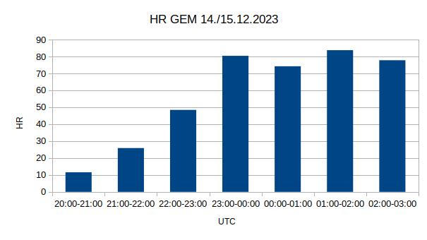 Habe meine Zahlen gerade an die IMO gemeldet. Deren Live-ZHR-Graph zeigt eine stetige Abnahme der Raten nach 20h UT am 14. 12.