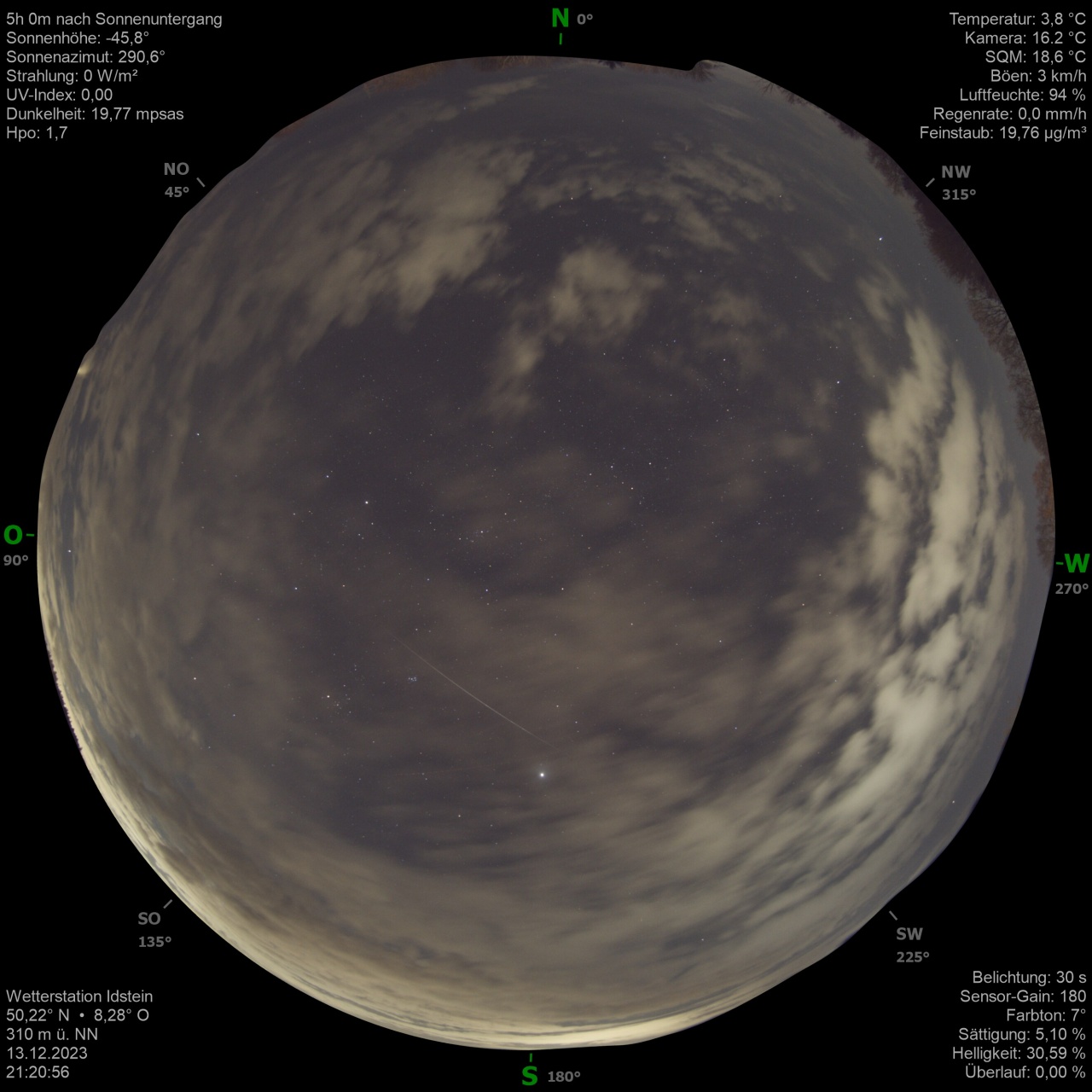 Fotografisch waren die Geminiden wie üblich eher enttäuschend (liegt wahrscheinlich am fehlenden Grün, das die Kamerasensoren mögen). Visuell in der Zeit nach Mitternacht (wo die Lichtverschmutzung unter der Woche zurückgeht) waren sie aber schon beeindruckend. Zeitweise echt viele kleine Meteore. Venushelle Exemplare hatte ich keine, aber ein paar schön über den halben Himmel langgezogene, die scheinbar in Zeitlupe vorbeiflogen und dabei taumelten - wie dieses hier, was sogar von der Allsky-Kamera eingefangen wurde (13.12 um 20:20 UT) :