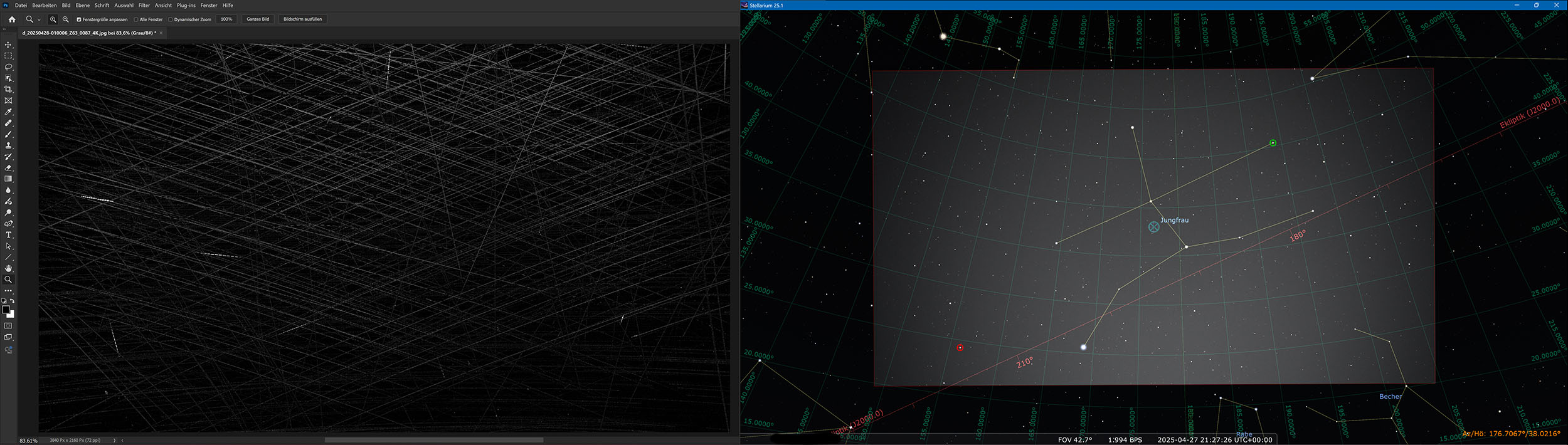 Das Bild zeigt rechts ein eingepasstes 32-Frame-Mittelbild von 23:27 MESZ in Stellarium.* Es soll nur die Ausrichtung der Kamera in der Nacht zeigen.