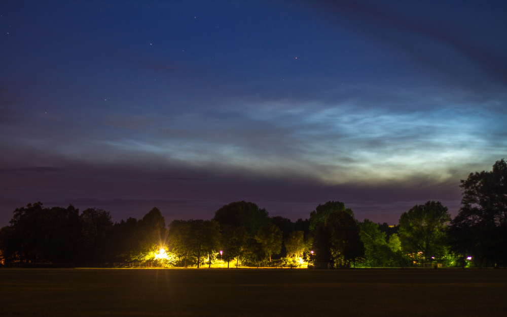 Hier war die Sicht mäßig, dennoch konnte ich die 12. NLCs dieses Jahr in ganz ordentlicher Helligkeit beobachten, ich vergebe eine 4. Insgesamt waren sie von ca. 00:35 bis 3:35 sichtbar, nicht höher als 12° und zwischen 330 und 010 Grad Azimut.