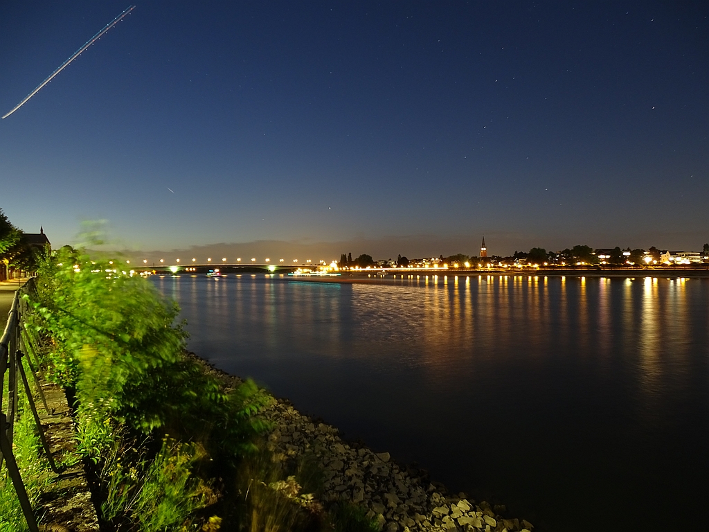Flare von Iridium 8 am 28.07.2015 um 22:48:42 MESZ; Helligkeit mindestens -4 mag, viel heller als vorhergesagt (-1.5 mag). Aufgenommen am Bonner Rheinufer mit einer Sony DSC-HX400V, Belichtungszeit 30s bei Blende 2.8 und ISO 100, Brennweite 24mm (Kleinbild).