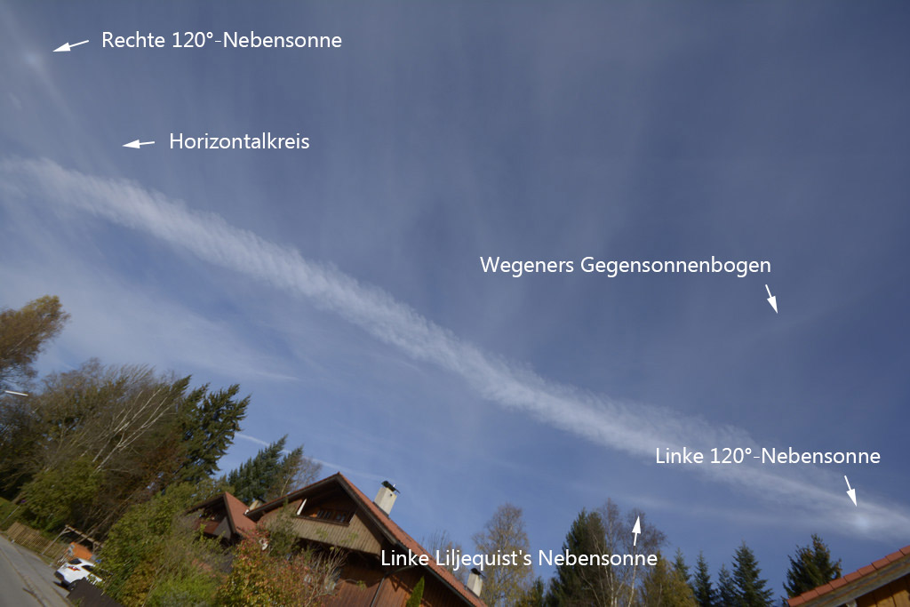 Kurz darauf wollten wir eigentlich einen Spaziergang machen. Aber bereits vor der Haustür war ein nahezu vollständiger Horizontalkreis mit beiden 120° Nebensonnen zu sehen - Premiere - und es sollte nicht die letzte bleiben.