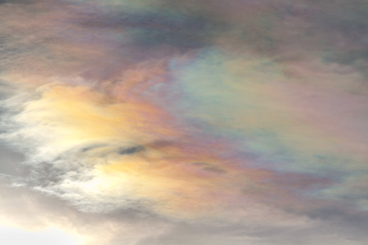 Interessant finde ich es nur dann, wenn die irisierenden Wolken einen weiten Abstand zur Lichtquelle (>25°) haben, da stellt sich mir dann tatsächlich die Frage, ob das ein Irisieren an Tröpfchen sein kann, oder eben doch an Eiskristallen. Evtl. sogar eine Mischung aus Brechung und Interferenz.