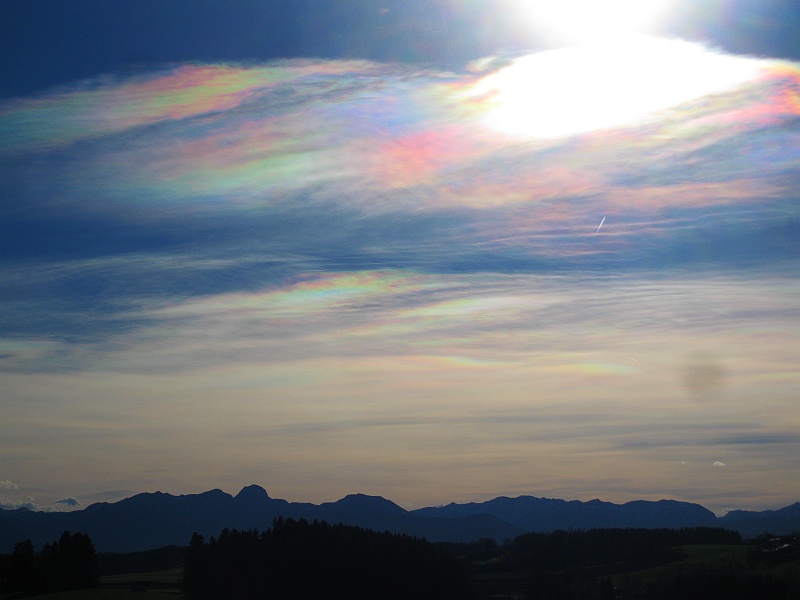 Interessant finde ich es nur dann, wenn die irisierenden Wolken einen weiten Abstand zur Lichtquelle (>25°) haben, da stellt sich mir dann tatsächlich die Frage, ob das ein Irisieren an Tröpfchen sein kann, oder eben doch an Eiskristallen. Evtl. sogar eine Mischung aus Brechung und Interferenz.
