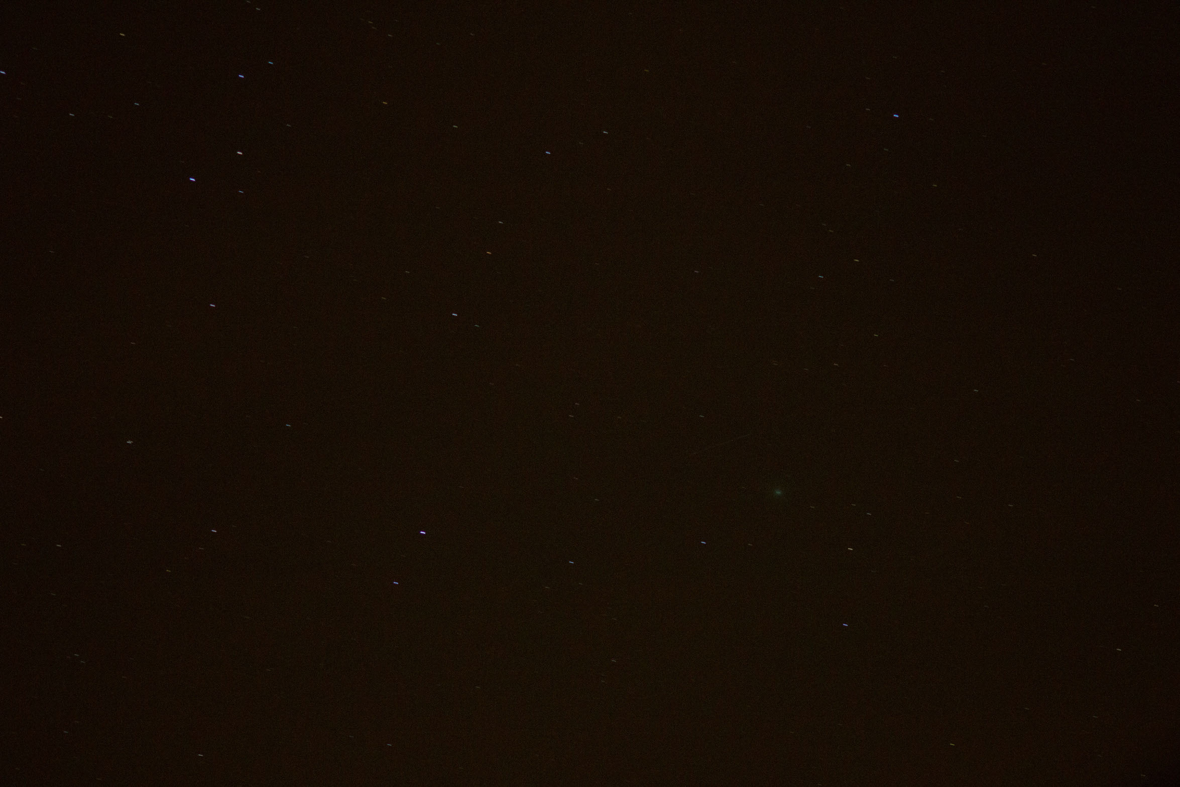 Besonders vorzeigbar ist mein Ergebnis noch nicht, aber einfach mal so als Beweis, dass man den Kometen selbst mitten in Berlin-Wedding, also inmitten der größten Lichtverschmutzung, aufs Bild bekommen kann. Es war sehr stürmisch gestern abend, mit durchrasenden Wolken, mit bloßem Auge war er nicht sichtbar.