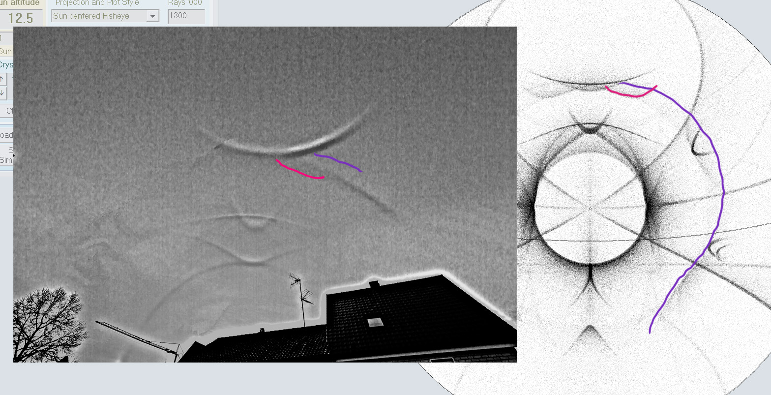 Als ich vor kurzem die Lowitz-Bezeichnungen für den Haloschlüssel überarbeitet habe, habe ich die Kategorie "oberer kreisförmiger Lowitzbogen" so angelegt, dass darin mit steigender Sonne der oberere den mittleren (Greenlers Namen) ablöst, weil das am verträglichsten mit den bisherigen Beobachtungsdaten ist. Da blieb natürlich das Problem mit der "Nahtstelle" in der Sonnenhöhe, d.h. dem sehr schmalen Bereich, in dem oberer und mittlerer Lowitz (und beide Parrys) gleichzeitig auftreten... und jetzt gibts ein paar Wochen später ausgerechnet zu diesem "Problemfall" Bildmaterial!