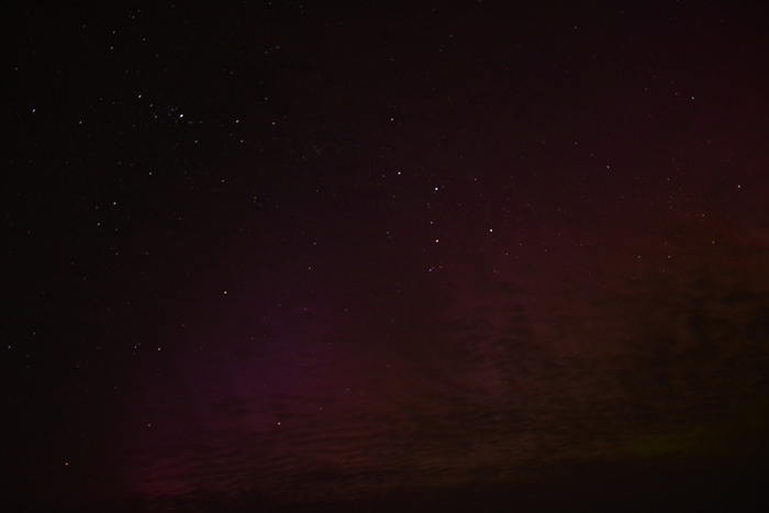 Auch hier im südlichen Thüringen, Nähe Bad Lobenstein war ein farbloses Polarlicht mit Beamern sichtbar. Auf den Fotos rot-violettes Licht mit deutlichen Beamern. Foto(s) folgen noch.
