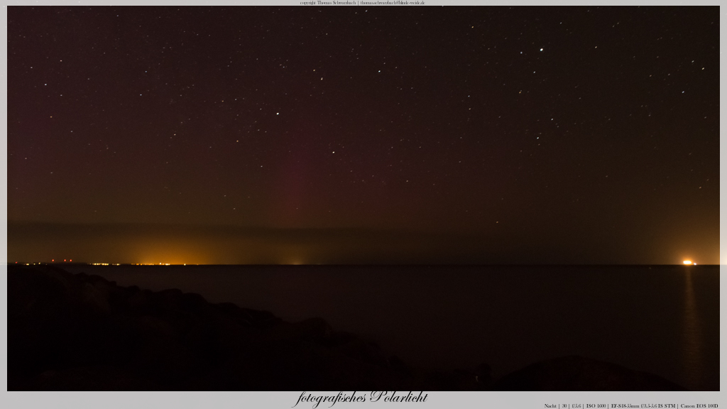 auch ich habe, so denke ich, meine ersten (und hoffentlich nicht letzten) fotografischen Polarlichter festhalten können. Die beiden Bilder sind 22:36 und 22:37 in Travemünde entstanden.