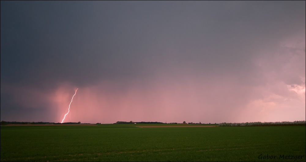 Und damit ich kein neues Thema aufmachen muß noch ein Blitzbild zu Sonnenuntergang vom Montag. Das erste Gewitter was auch schön kräftig war